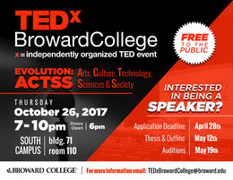 The theme this year for TEDx Broward College 2017 is EVOLUTION: ACTSS (Arts, Culture, Technology, the Science, and Society). Student speakers are encouraged to develop a speech that demonstrates an evolution of self and/or any discipline as it relates to the Arts, culture, technology, the sciences or society.